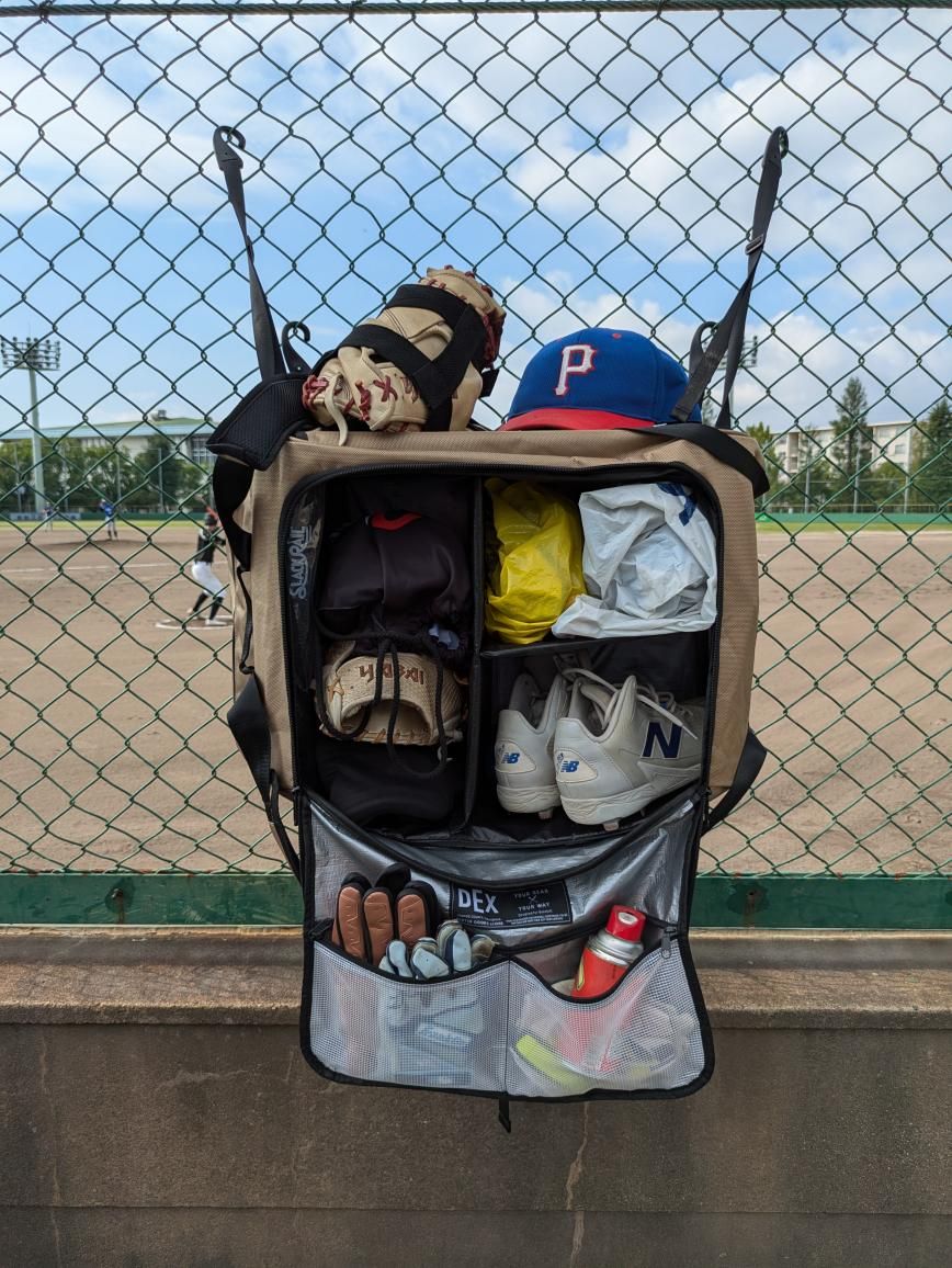 バッグを掛けたまま出し入れできるから、グラウンドでも自分だけのロッカー感覚で使える。