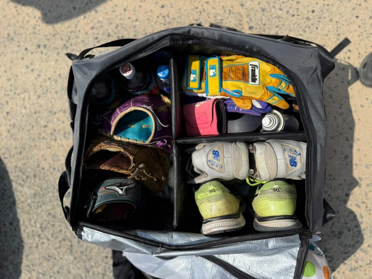 バッグを掛けたまま出し入れできるから、グラウンドでも自分だけのロッカー感覚で使える。
